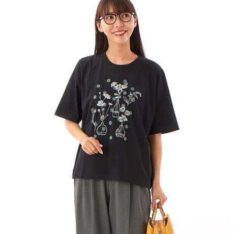 ドットと初夏の花々を花瓶に飾った刺繍が、涼しげな印象を与えてくれます。