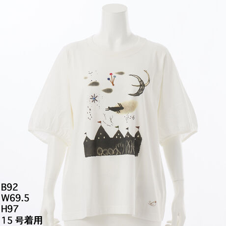 オバタクミさんの作品をフロントに大胆にプリントしたパフスリーブのTシャツ。