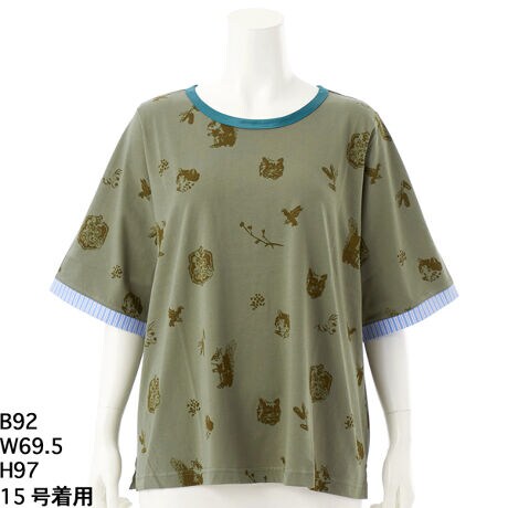 庄島歩音さんの描くネコやリス、鳥などのモチーフを基に柄を構築し、単色の総柄プリントに落とし込んだシンプルなシルエットのTシャツ。