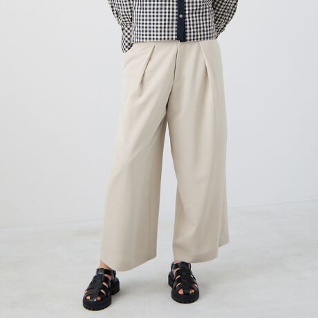 リラクシーで綺麗見えが叶う素材や楽に履けるウエストゴムのイージーな仕様、シルエットがINタックのワイド型。