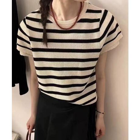 マリンテイスト漂うボーダーデザインの半袖ニットトップス。コンパクトなシルエットと袖口のさりげないフリル風の仕上げが女性らしさをプラスします。