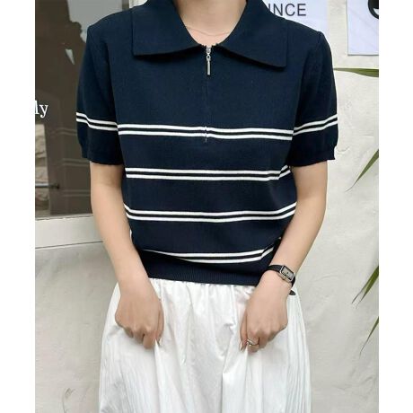 フロントにジップ付きのデザインで、スポーティーな印象を与えるボーダーニットトップス。程よくフィットするシルエットで、スッキリとした大人カジュアルスタイルに!!