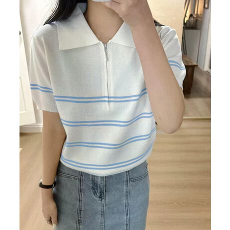 フロントにジップ付きのデザインで、スポーティーな印象を与えるボーダーニットトップス。程よくフィットするシルエットで、スッキリとした大人カジュアルスタイルに!!