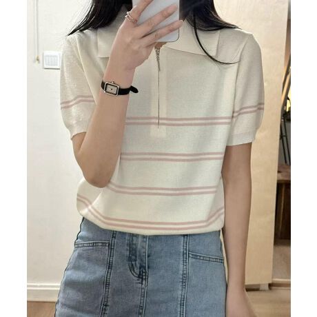 ジップ付きボーダーポロニットトップス