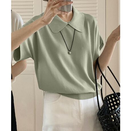 丸襟付き半袖ニットトップス