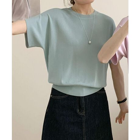 クルーネックリブ編み半袖ニットトップス