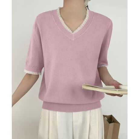 やさしい色合いが魅力のVネック半袖ニット。
