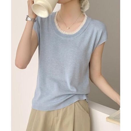 首元の配色デザインがアクセントになった、大人カジュアルな半袖ニットトップス。シンプルな中にセンスが光る、使い勝手の良い一枚です。