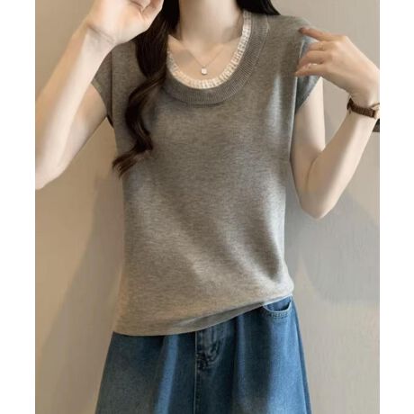 首元の配色デザインがアクセントになった、大人カジュアルな半袖ニットトップス。シンプルな中にセンスが光る、使い勝手の良い一枚です。