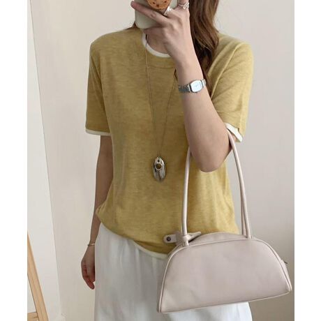 首元の配色がさりげないアクセントになったリブニットトップス。大人カジュアルにぴったりの一枚です。