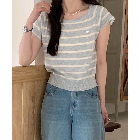 爽やかなボーダー柄にボートネックデザインを組み合わせた、大人カジュアルな半袖ニットトップス。首元をすっきり見せてくれるデザインで、抜け感のあるスタイルに♪