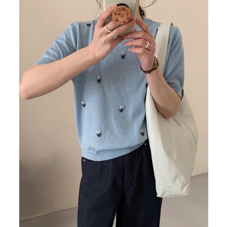 ハート刺繍入り半袖ニットトップス