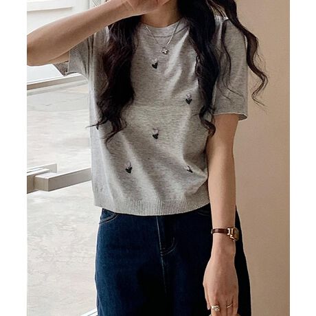 小さなハートの刺繍が全体に散りばめられた、ガーリーで愛らしい半袖ニットトップス。シンプルなシルエットにほどよい甘さをプラスした一枚です。