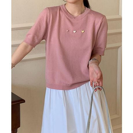 胸元にカラフルなハートが並んだ、遊び心あふれる半袖ニットトップス。シンプルなフォルムに可愛らしいアクセントを加えた、大人ガーリーな一枚です。