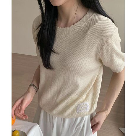 ワッペン付きクルーネック半袖ニットトップス