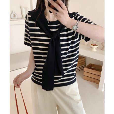 肩にかけたようなカーディガン風デザインが目を惹く、大人可愛い半袖ニットトップス。シンプルなシルエットに遊び心あるディテールをプラスした一枚です。