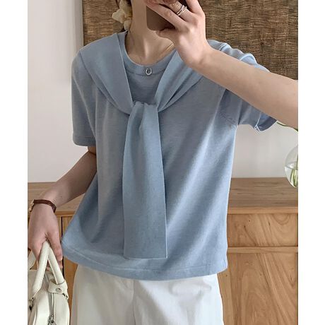 肩にかけたようなカーディガン風デザインが目を惹く、大人可愛い半袖ニットトップス。シンプルなシルエットに遊び心あるディテールをプラスした一枚です。