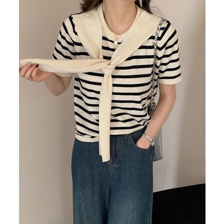 肩にかけたようなカーディガン風デザインが目を惹く、大人可愛い半袖ニットトップス。シンプルなシルエットに遊び心あるディテールをプラスした一枚です。