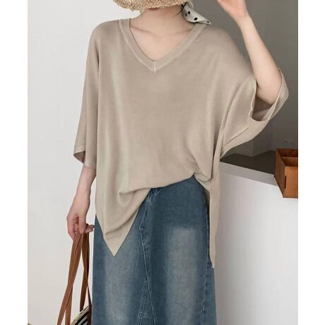 ゆったりとしたVネックデザインが特徴のニットトップス。シンプルながら抜け感のあるシルエットで、カジュアルにもきれいめにも着回し可能。