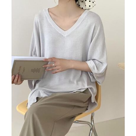 ゆったりとしたVネックデザインが特徴のニットトップス。シンプルながら抜け感のあるシルエットで、カジュアルにもきれいめにも着回し可能。