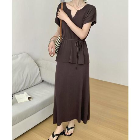 シンプルな半袖トップスとスカートのセットアップ。さらっとした生地感で肌に心地よく、夏でも快適に着用できます。