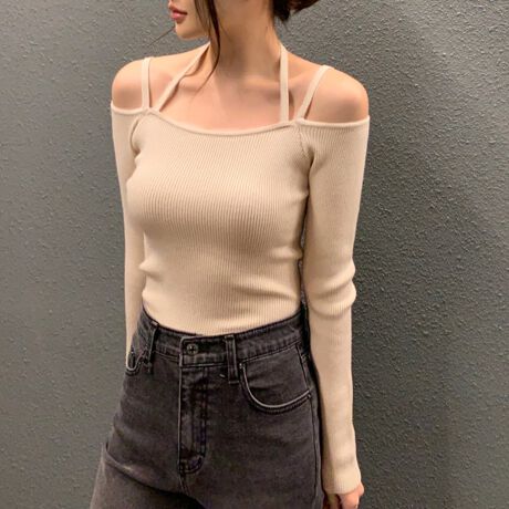 オフショルダーで肩紐付きのデザインがチャームポイントの春秋おすすめニットトップスが新登場♪