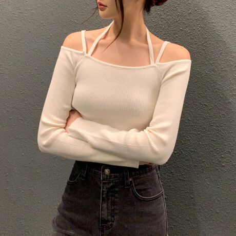 オフショルダーで肩紐付きのデザインがチャームポイントの春秋おすすめニットトップスが新登場♪