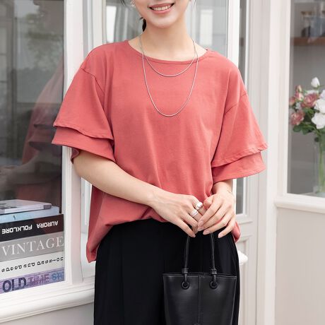 ダブルに重なったフリルな袖口でややボリューム感がありながら、ラウンドネックでスッキリ綺麗めに仕上げました。