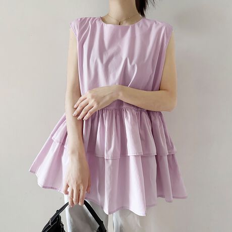 裾のフレアティアードデザインがチャームポイントの春夏おすすめのノースリーブブラウスが新登場♪