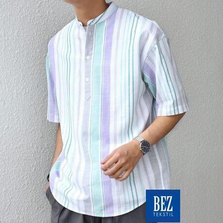 ◆ BEZ TEXTILE マルチカラー ストライプ/ソリッド ボタンダウン ショートスリーブ シャツ