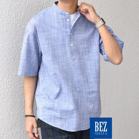 エーゲ海コットンを使用した、大人の半袖バンドカラープルオーバーシャツ