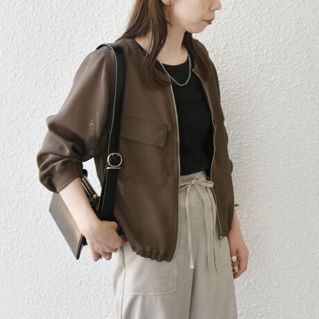 ジップデザインとメッシュ素材でスポーティな雰囲気がありつつも、透け感やノーカラーのデザインが女性らしさを演出。
