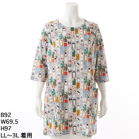 LL~3L対応/バスト117・着丈82・肩幅39・二の腕幅23・袖丈40・袖口幅14・裾幅72cm4L~5L対応/バスト130・着丈82・肩幅43・二の腕幅23・袖丈42・袖口幅15・裾幅77cm