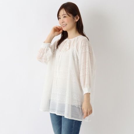 ギャザーがたっぷり入ったシルエットと、総刺繍が可愛らしいプルオーバーです。