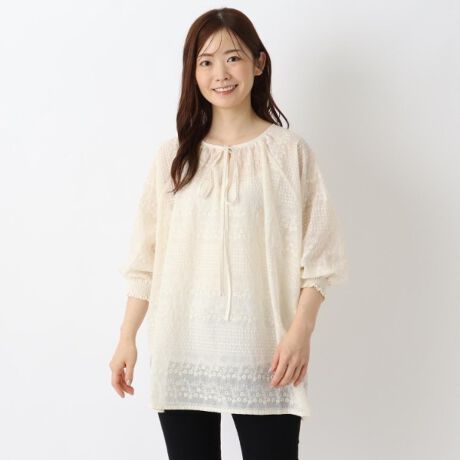 ギャザーがたっぷり入ったシルエットと、総刺繍が可愛らしいプルオーバーです。