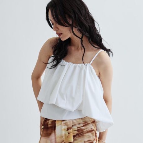 肩を大胆に見せながら、軽やかで洗練されたシルエットを演出します。