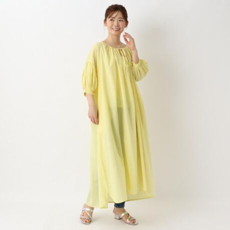 袖と首周りのボリューミーなギャザーが印象的なワンピースです。