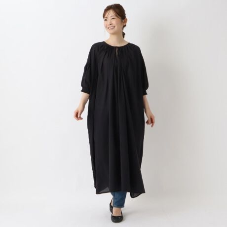 袖と首周りのボリューミーなギャザーが印象的なワンピースです。