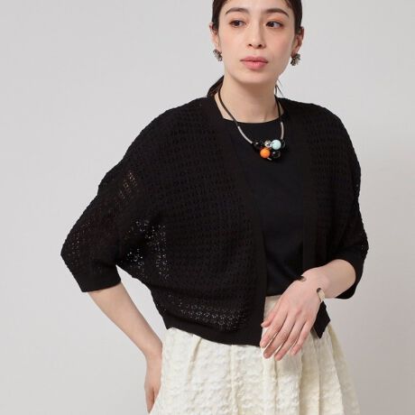 程良い透け感のあるメッシュ編みが今年らしいドルマンスリーブのボレロ。