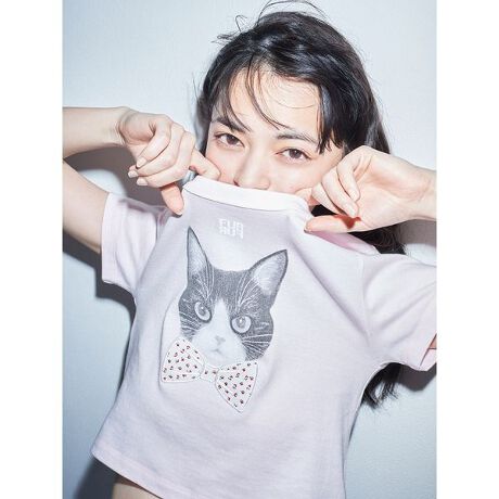 上國料萌衣さんとのコラボ第三弾。上國料さんの愛猫Hanaをモデルにした遊び心溢れるデザインのアイテムです。フロントにはアップリケの蝶ネクタイが施され、可愛らしさとユニークさを兼ね備えています。サイズはコンパクトシルエットとオーバーサイズの2展開で、お好みに合わせて選べます。どちらも個性的でありながら、普段使いしやすいデザインに仕上がっています。