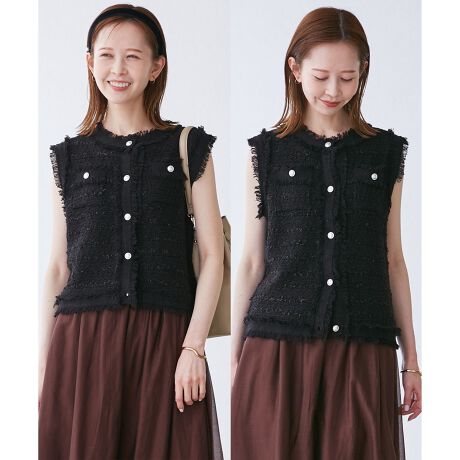 ・ファンシーツイードのように編んだスリーブレスニットカーディガン。