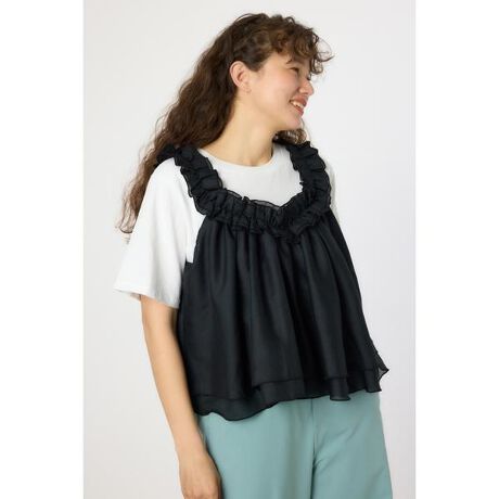 ■ポイントビスチェがドッキングされたデザインのトップスです。レイヤードスタイル風で、普段のコーディネートがワンランクアップするアイテムです。■ディティールフリルショルダーの扱い方によって2WAYのスタイリングでアレンジが楽しめます。■スタイリングドッキングデザインなので1枚で完結します。デニムでカジュアルに合わせるのがおすすめです。■生地身生地の天竺生地には、タオルにも使われているOE糸を使用することで、適度な空気を含んでいるためシャリ感がある生地に仕上がっています。キャミ部分の生地は少し透け感があるものの、しっかりとした布帛生地です。■透け感:ややあり■光沢感:なし■伸縮性:あり■裏 地:なし[注意事項]※画像の商品はサンプルです。実際の商品と仕様、加工が若干異なる場合があります。※画像の商品は光の照射や角度、お使いのモニター環境により、実物と色味が異なる場合がございます。※着用、お取り扱いの際は、アテンションタグをご確認ください。
