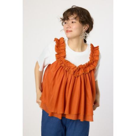 ■ポイントビスチェがドッキングされたデザインのトップスです。レイヤードスタイル風で、普段のコーディネートがワンランクアップするアイテムです。■ディティールフリルショルダーの扱い方によって2WAYのスタイリングでアレンジが楽しめます。■スタイリングドッキングデザインなので1枚で完結します。デニムでカジュアルに合わせるのがおすすめです。■生地身生地の天竺生地には、タオルにも使われているOE糸を使用することで、適度な空気を含んでいるためシャリ感がある生地に仕上がっています。キャミ部分の生地は少し透け感があるものの、しっかりとした布帛生地です。■透け感:ややあり■光沢感:なし■伸縮性:あり■裏 地:なし[注意事項]※画像の商品はサンプルです。実際の商品と仕様、加工が若干異なる場合があります。※画像の商品は光の照射や角度、お使いのモニター環境により、実物と色味が異なる場合がございます。※着用、お取り扱いの際は、アテンションタグをご確認ください。