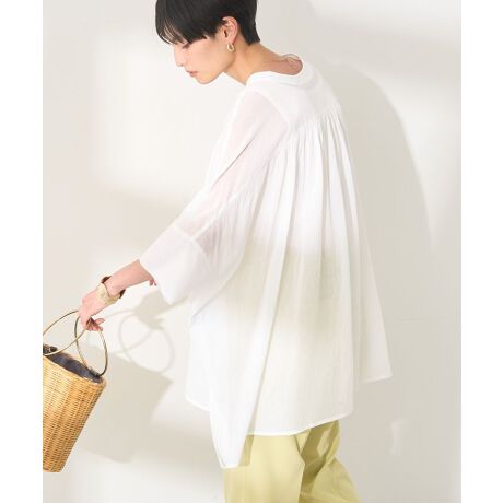 身幅を大きくとったボックスシルエットと キーネックの抜け感が女性らしい綺麗な首元を演出してくれます。
