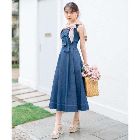 ひとめ惚れリボンと、美シルエット。一枚で“かわいい”が完成する主役ワンピ【Design】・デニムライクな素材で仕立てた、甘すぎない大人フェミニンなノースリーブロングワンピース。・フロントには立体的なリボンをあしらい、シンプルながらも視線を惹きつけるアクセントに。・高めのウエスト切り替えとタック入りのデザインで、脚長&細見えが叶います。・バックはゴム&レースアップ仕様で、体にフィットしながらサイズ調整もラクに◎。・肩周りの露出が気になるときは、シアーブルゾンや軽めのカーディガンとのレイヤードスタイルがおすすめ♪・一枚で着映える存在感と、着心地のよさを両立した、春夏のフェミニンスタイルにぴったりな一着です。・左脇にファスナー付き。【Fabic】・夏服にぴったりなデニムライクな生地を使用。・ネイビー、ブラックの2色展開となります。【Care】ドライクリーニング