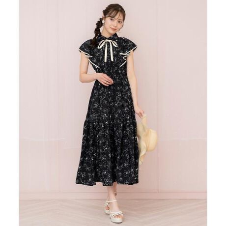 繊細なラインフラワーデザインがお上品見えさせてくれる、ノースリーブのロングワンピース【Design】・ラインで描かれた繊細なフラワーモチーフが目を引く、上品なティアードワンピース。・肩先をやさしくカバーしてくれるラッフルフリルと、配色のパイピング&リボンタイが可憐なアクセントに♪・ノースリーブでも肌見せ感を抑えたデザインで、抜け感のあるフェミニンスタイルが完成します。・ウエストはシャーリング仕様で、自然なフィット感とストレスフリーな着心地を叶えてくれます◎・ティアードデザインのスカートは、軽やかに揺れるフレアが女性らしさを引き立てるポイント!・フロントはボタン留め仕様で、シャツ襟とピンタックデザインがきちんと感も演出♪【Fabic】・優しい肌触りで軽い着心地の生地を使用。・程よいハリ感のある裏地付き。・ご自宅でお手入れが出来るのも嬉しいポイント♪・ホワイト、ラベンダー、ブラックの3色展開となります。【Care】手洗い可能