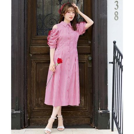 ギンガムチェックドロストオープンショルダーワンピース