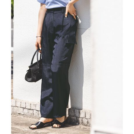 ヴィンテージ加工を施したタフタ素材の落ち感が女性らしく、メンズライクなデザインのアイテムをバランスよく穿きこなすことが可能。