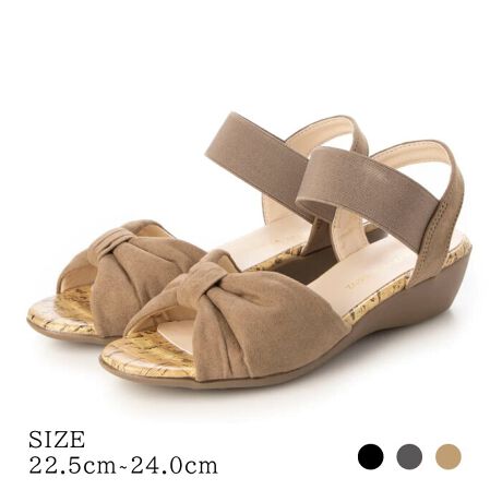 足元に華やかさをプラスする、大きめリボンが印象的なウェッジソールサンダル。柔らかなスエード調素材とナチュラルなコルク風ソールの組み合わせが、大人可愛いスタイルを演出します。太めのヒールで安定感があり、歩きやすさも◎。デートやお出かけにもぴったりな1足です。