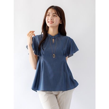 軽さあるフレアの袖が品よく、ネックのスタンドカラーも堅すぎず女性らしくスリットを入れてきちんと感を出しています。